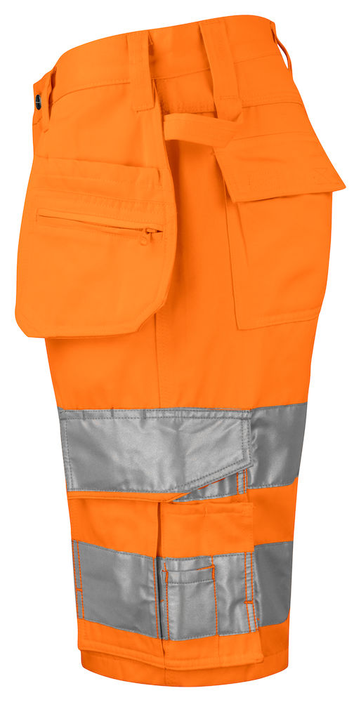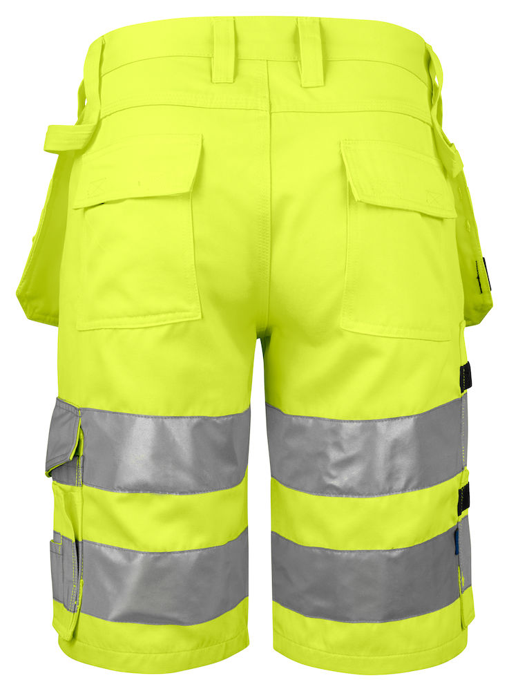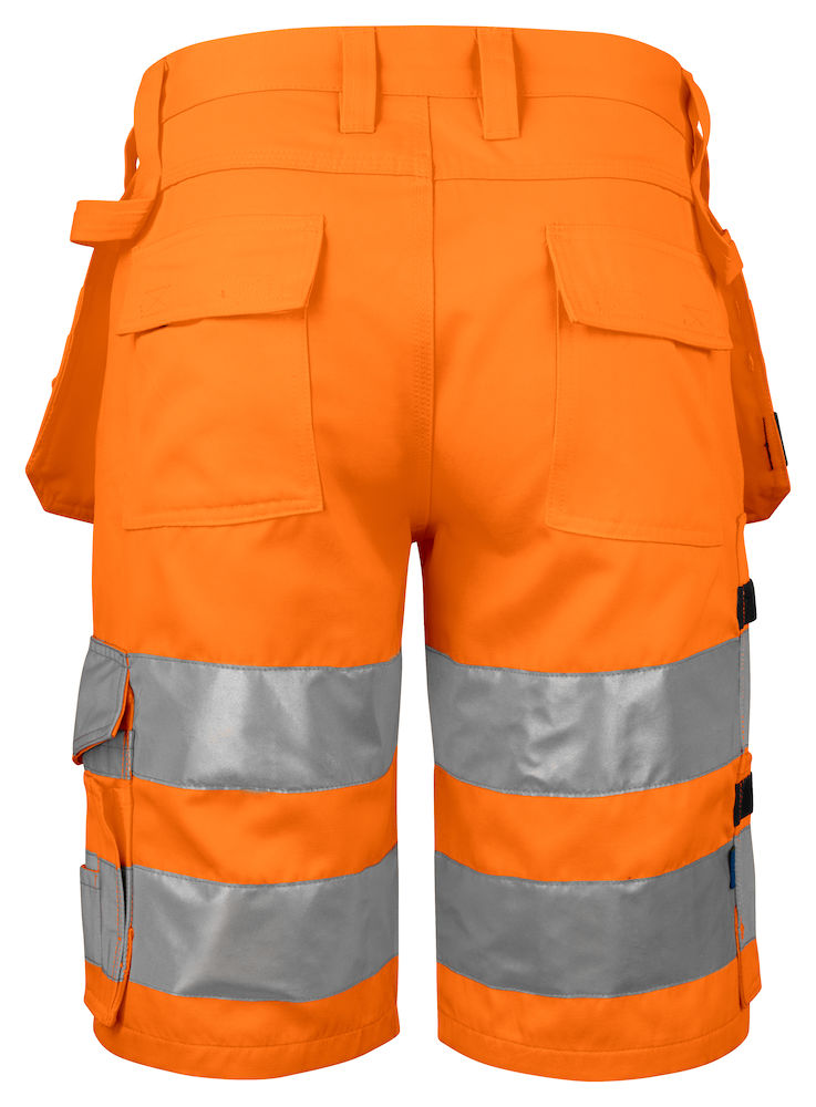 80% Poliestere 20% Cotone – 245 g/mq – Bermuda multitasche – Due tasche laterali e taschino con cerniera – Due tasche posteriori – Un tascone cargo con vano porta smartphone e scomparti porta attrezzi – EN ISO 20471 Classe 2