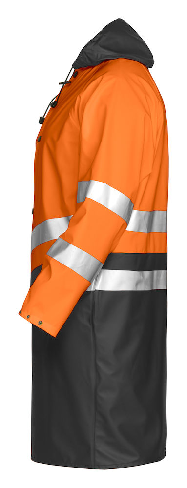 100% Poliammide 170 g/mq – Spalmatura in Poliuretano – Antipioggia – Apertura divisibile con bottoni rapidi – Cuciture termo nastrate – Cappuccio regolabile – Polsini elasticizzati – Lunghezza 100 cm – Forma un completo se abbinato all’articolo 6504 – EN ISO 20471 Classe 3