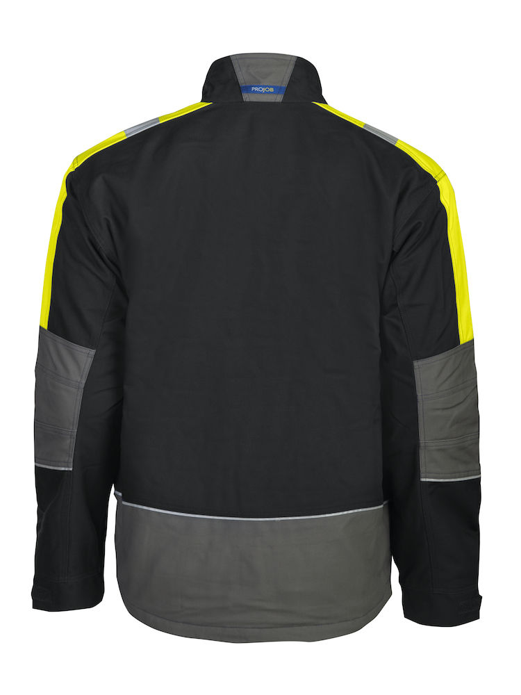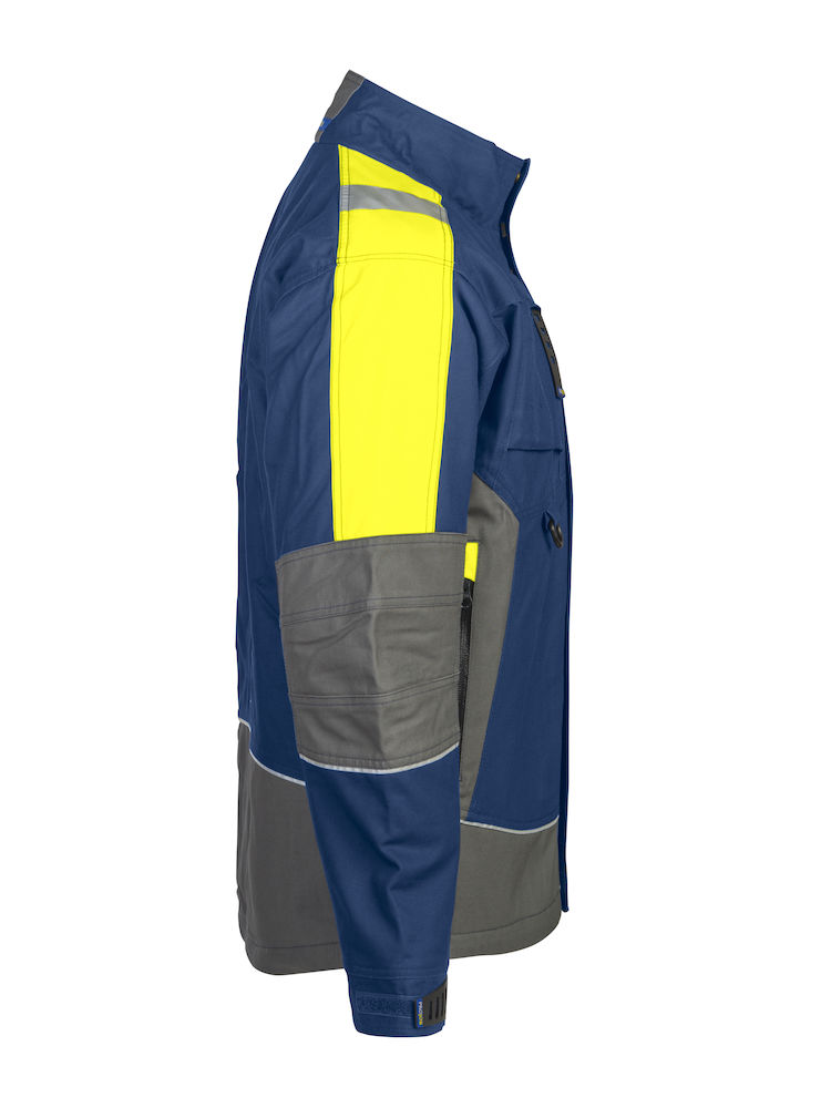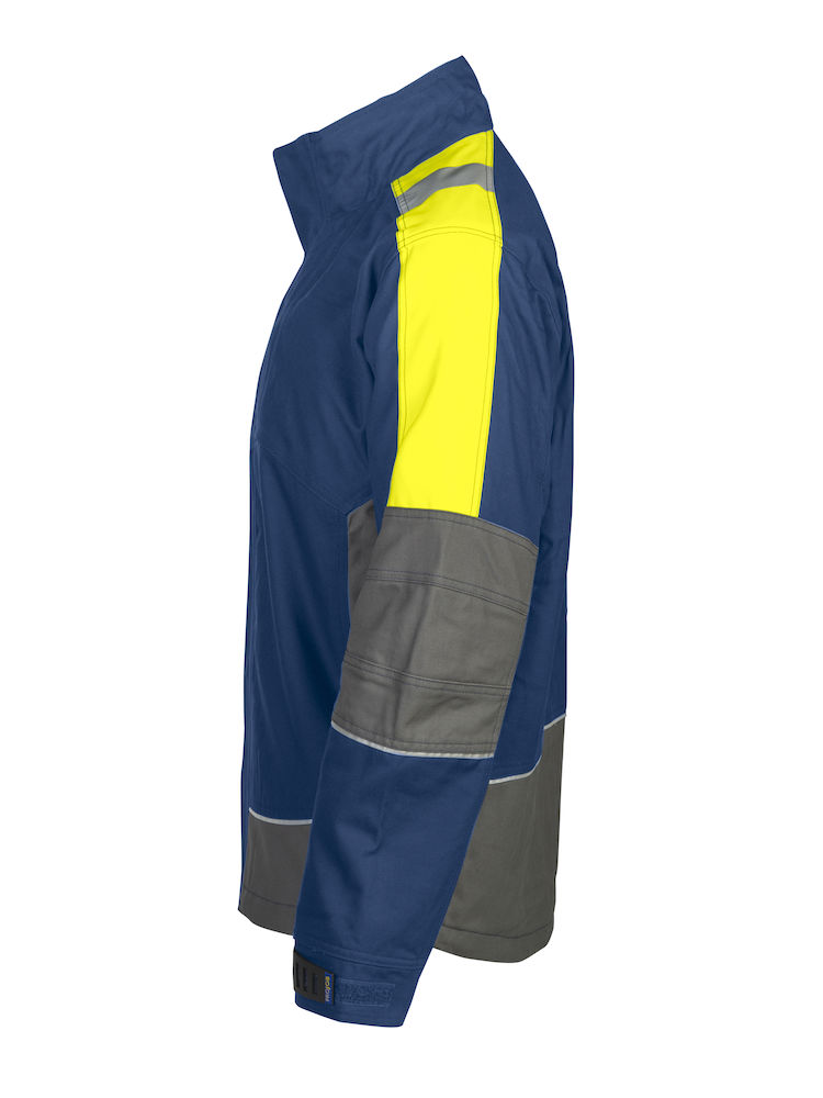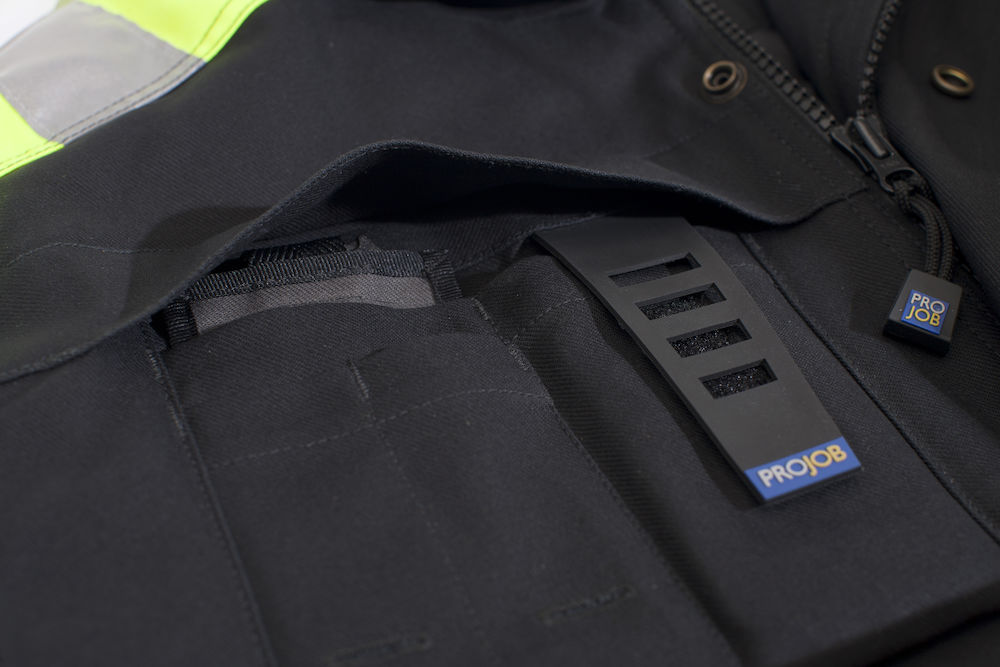 Giacca tecnica imbottita. Cerniera divisibile coperta. Due tasche sul petto, una con cerniera e vano per smartphone. Due tasche interne con cerniera. Colletto foderato in pile, spalle e maniche in contrasto fluorescenti con banda alta visibilità. Anello porta badge. Coulisse elasticizzata. Foderata con cerniera per agevolare stampe e ricami.