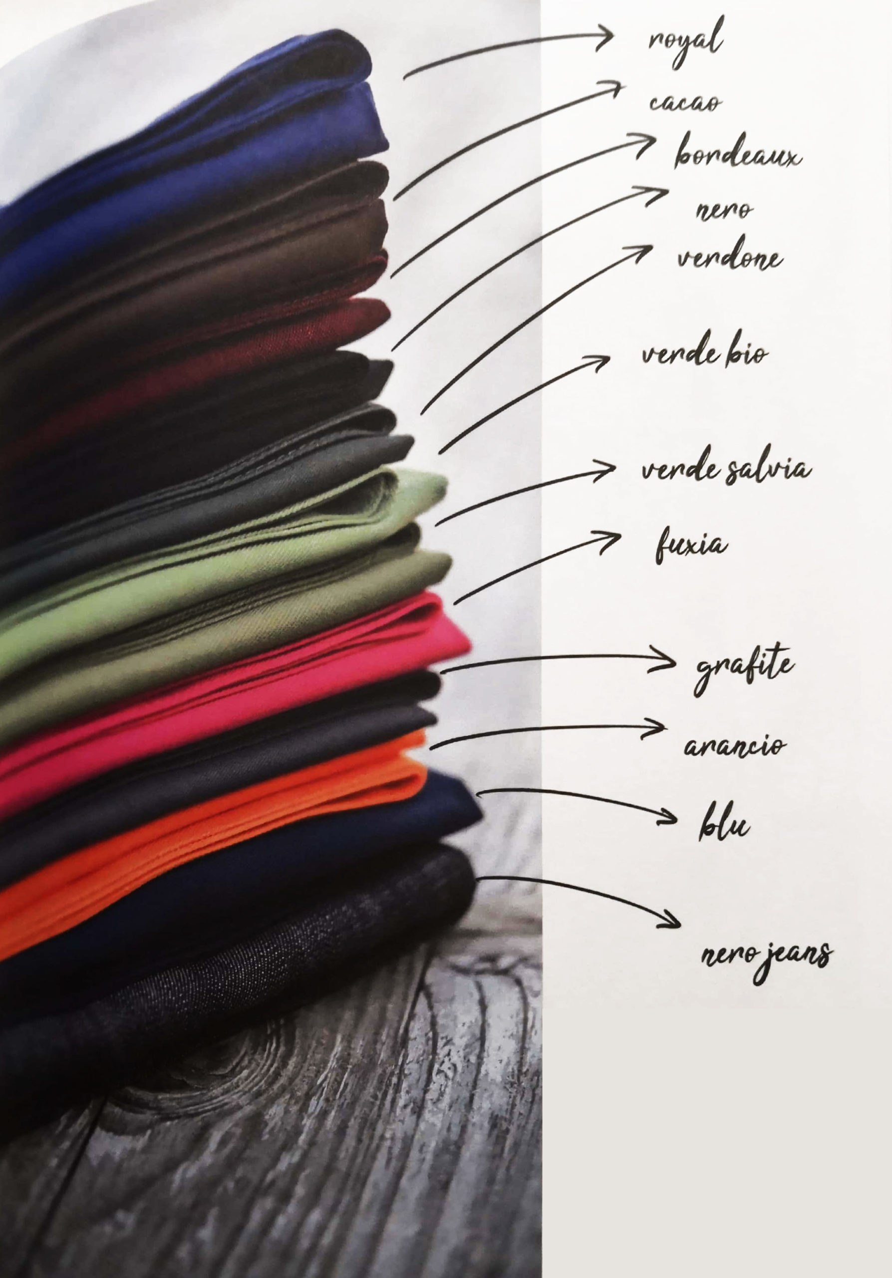 Arancio, Bianco, Black Jeans, Blu, Blu Royal, Bordeaux, Cacao, Fucsia, Grafite, Verde Bio, Verde Salvia, Verdone