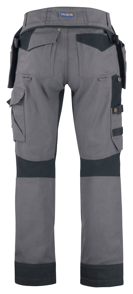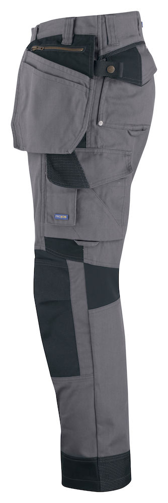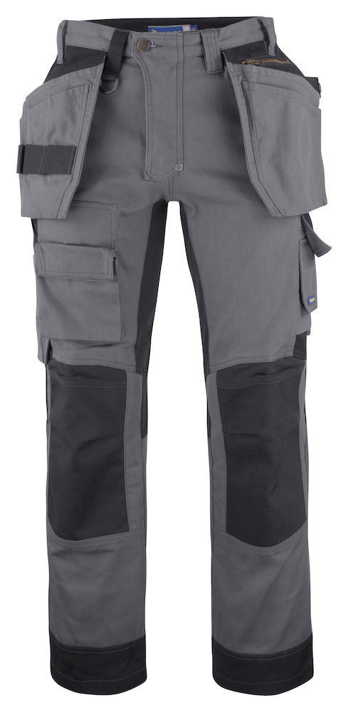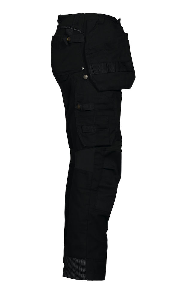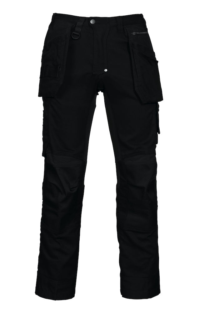 Pantalone tecnico. Due tasche flottanti a scomparsa, con asola porta utensili. Due tasche ai fianchi. Un tascone cargo con vano per smartphone, una tasca porta metro, livella e matita. Due tasche posteriori. Anello porta badge. Predisposizione per tasche rigide supplementari. Tasche per ginocchiere rinforzate in Kevlar. Profili rifrangenti in Cordura®