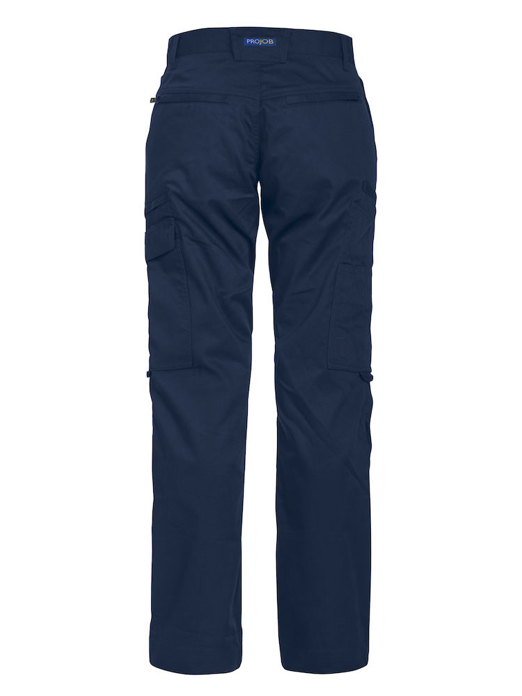 Pantaloni tecnico donna multitasche. Due tasche laterali e taschino con cerniera. Due tasche posteriori, un tascone cargo con vano porta telefono sagomato e predisposizione per tasca rigida supplementare, una tasca con zip, una tasca porta metro, livella, matite ed utensili. Anello porta chiavi e porta badge. Due tasche interne per ginocchiere.