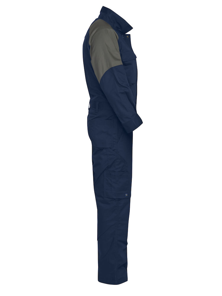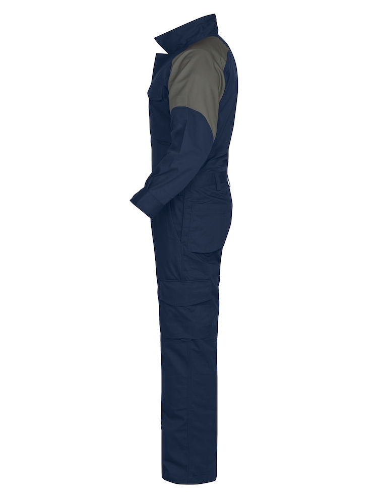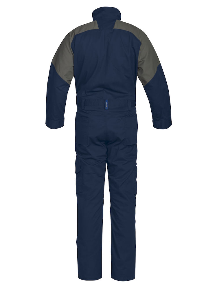 Tuta intera bicolor. Cerniera con doppio cursore. Due tasche sul petto. Due tasche laterarli, una con taschino e zip. Due tasche posteriori. Due tasche sulle gambe, una con vani per metro e livella. Passanti per cintura ed elastico in vita regolabile. Predisposizione per tasche rigide supplementari.